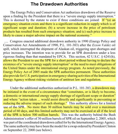 In 2008 the Congressional Research Service issued a report titled “The Strategic Petroleum Reserve: History, Perspectives and Issues” (pdf link) which describes the legal requirements for a President to order a draw on the SPR. Initially created as strictly a emergency stockpile for domestic supply disruptions, in 2005 Congress loosened the drawdown criteria and explicitly contemplated IEA cooperation.