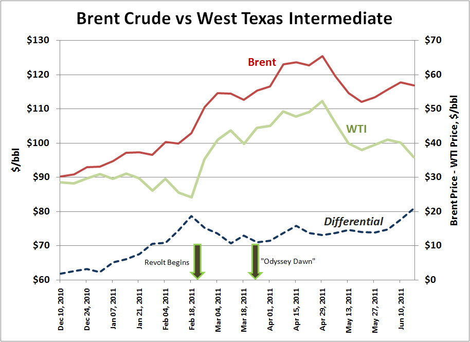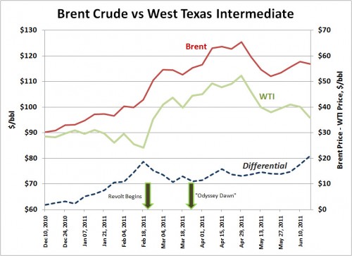 Events in Libya took 1.5 million barrels per day off the world market. The graph below shows a six-month timeline of crude oil prices, showing the effect of Libya’s turmoil on the spot prices for “West Texas Intermediate”, the dominant U.S. benchmark crude oil, and “Brent North Sea”, the European standard.