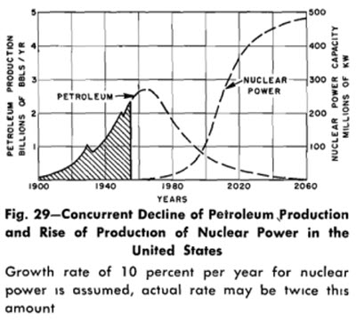 …Fig. 30 … covers the time span from 5,000 years ago — the dawn of recorded history — to 5,000 years in the future. On such a time scale the discovery, exploitation and exhaustion of the fossil fuels will be seen to be an ephemeral event in the span of recorded history. There is promise, however, provided mankind can solve its international problems and not destroy itself with nuclear weapons, and provided the world population (which is now expanding at such a rate as to double in less than a century) can somehow be brought under control, that we may at last have found an energy supply adequate for our needs for at least the next few centuries of the “foreseeable future.”