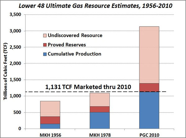 Fig. 1: Lower 48 Ultimate Gas Resource Estimates, 1956-2010. MKH = M. King Hubbert. PGC = Potential Gas Committee.