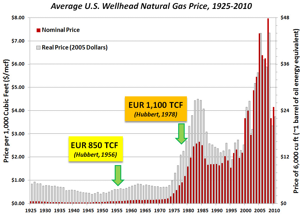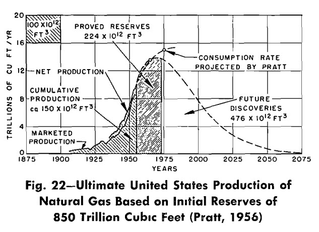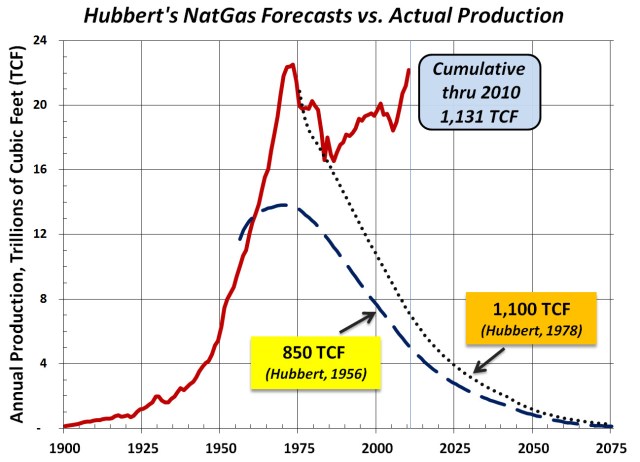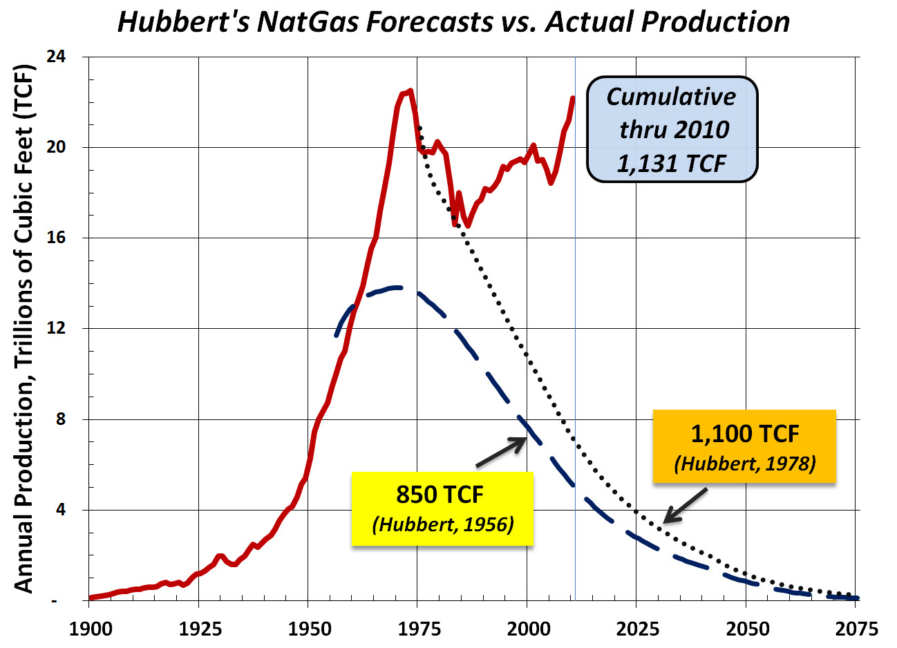 In 1956, Hubbert’s estimate of the amount of natural gas that would ultimately be consumed in the U.S. was 850 trillion cubic feet (TCF).