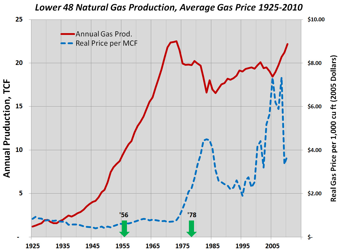 Fig. 6: Real Wellhead Price and Lower 48 Gas Production, 1925-2010