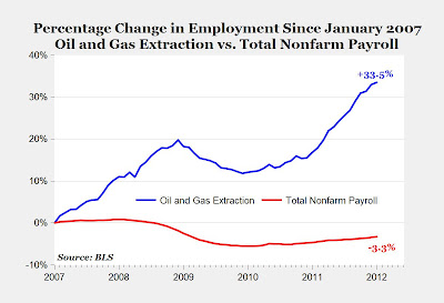 The chart above displays the monthly percentage changes in employment levels since January 2007 for oil and gas extraction jobs compared to total nonfarm payroll jobs. As of January 2012, payroll employment is 3.3%, and 4.7 million jobs, below the month of January five years ago. In contrast, the explosion of new oil and gas jobs has increased employment in that industry by about 1/3 since January 2007. Over the last 12 months, oil and gas companies have added 23,200 new workers, at a rate of almost 100 new hires every business day.