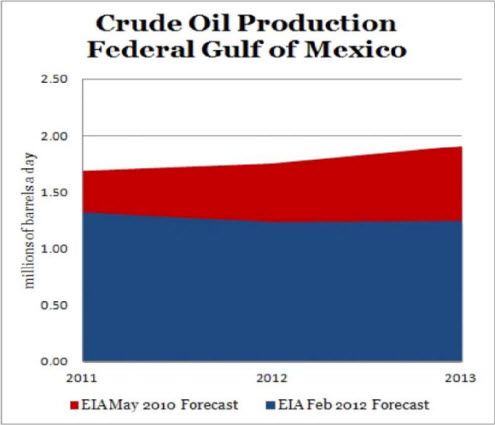 The study further confirms what has previously been reported in these pages: current levels of oil production (in blue) from the Gulf are running 30% below what was expected in the last pre-Macondo production forecast (in red):
