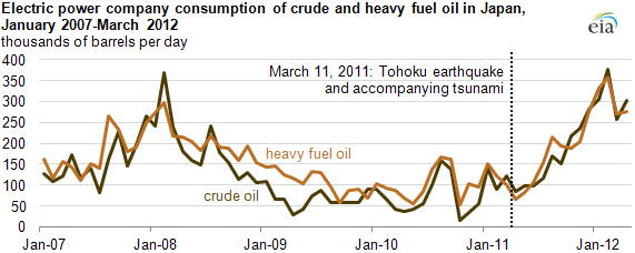 {Editor’s note: Both crude oil and fuel oil usage have increased from 100,000 to 300,000 barrels per day in the last year. That’s enough to be noticed in the world markets. Using oil for electricity generation is like swatting flies with a baseball bat. But since Japan has no native source of natural gas, there are few alternatives. SM}