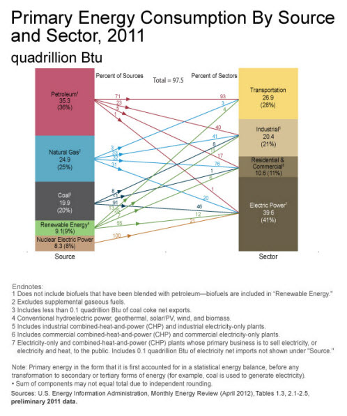 The following EIA chart is kind of busy at first glance, but it contains a wealth of information on U.S. energy sources and uses.