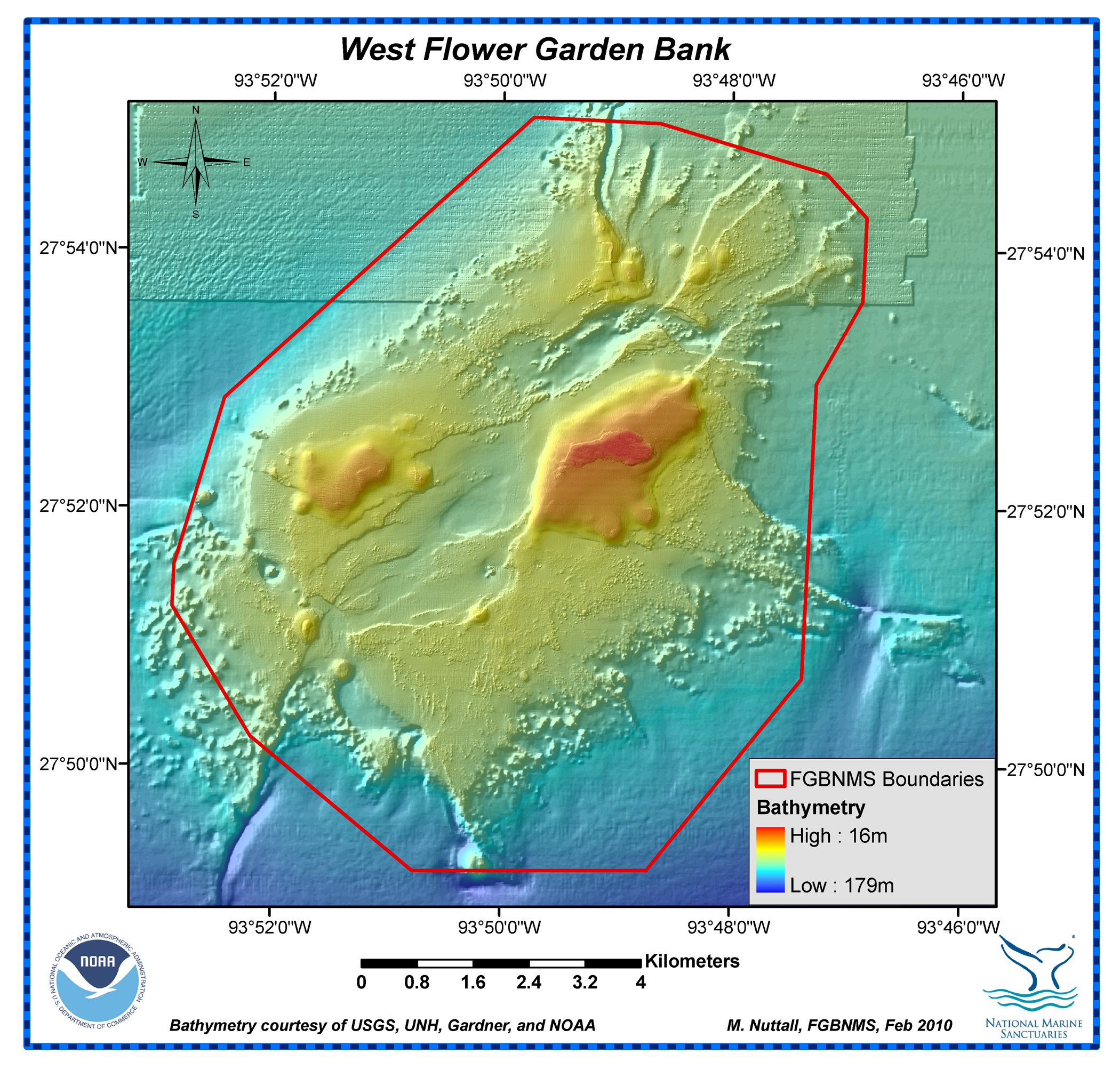 As an article in yesterday’s New York Times points out, in many cases platform removal is more damaging to marine life than simply leaving in place. They look in particular at a platform designated High Island 389-A, operated by W&T Offshore. What makes it unusual is that it is located near the Flower Garden Banks, our northernmost living coral reefs. They lie 115 miles southeast of Galveston, surrounded by water nearly 500 feet deep near the edge of the continental shelf. The reefs extend up into the light zone, in less than 50 feet of water at the shallowest point.