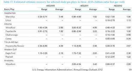 EIA’s Table 17 (click any image to enlarge) shows how reserve estimates have changed in the last three AEOs. In particular, the estimate for average recovery of a well in Louisiana’s Haynesville Shale was 4.59 billion cubic feet (BCF) per well in AEO2010, 3.58 BCF in AEO2011, and only 2.67 BCF per well in this most recent AEO2012. Just as surprising is the inset graph in Figure 54 above, which suggests that a typical Haynesville well produces >95% of its reserves in the first 5 years. The wells produce at phenomenal rates to begin with, but decline rapidly due to the constrained flow properties of ultra-tight shale rocks.