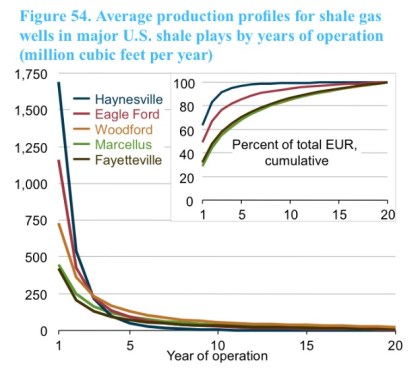 The curves in Figure 54 at left represent averages for many wells; each well is an individual. But what this curve fails to make explicit is the fact that there are very few wells in these shale gas plays with more than four years of history; the rest is projection.
