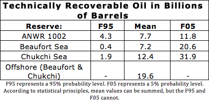 The risk-weighted reserve estimates for both the Chukchi and Beaufort areas offshore exceed the estimated ANWR reserves, but ANWR is more geographically compact and could come on production sooner. ANWR might produce 958,000 barrels per day, compared to the combined estimate for both offshore areas combined of just over 1,000,000. Given an operating window of only a few months per year, it will take many decades to realize the full reserve potential offshore. (For perspective, current total U.S. crude oil production including Alaska is 5.5 million barrels per day.)