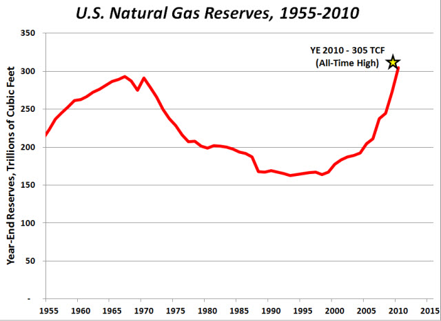 If the oil picture seems rosy, the natural gas story is even better. Gas reserves are already (YE 2010) the highest in history at 300 trillion cubic feet, having increased for twelve straight years. The gas production rate, expected to average 69 billion cubic feet per day in 2012, is also the highest ever.