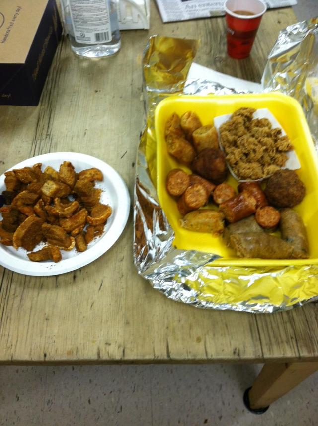 Cracklins, boudin, boudin balls, andouille, fried gizzards and (WTF?) egg rolls.