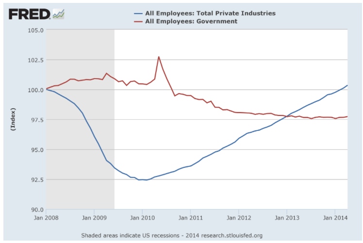 Matt Yglesias, boy genius and resident economics expert at Ezra Klein’s Vox.com, recently posted the following banality under the title “The Private Sector is Up, the Public Sector is Down”.