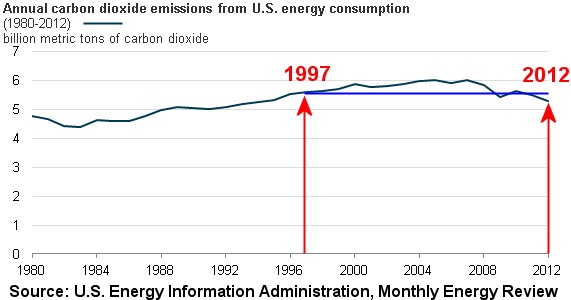 But ironically, the U.S. alone among the major developed countries met its Kyoto goals, and we did it without seriously hobbling the economy. How? Two words: natural gas. Oh, and one more word: fracking.