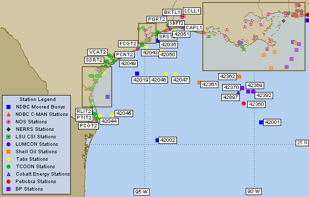 Station 42002 is located just below center on the map below. Not all of the stations have active data.
